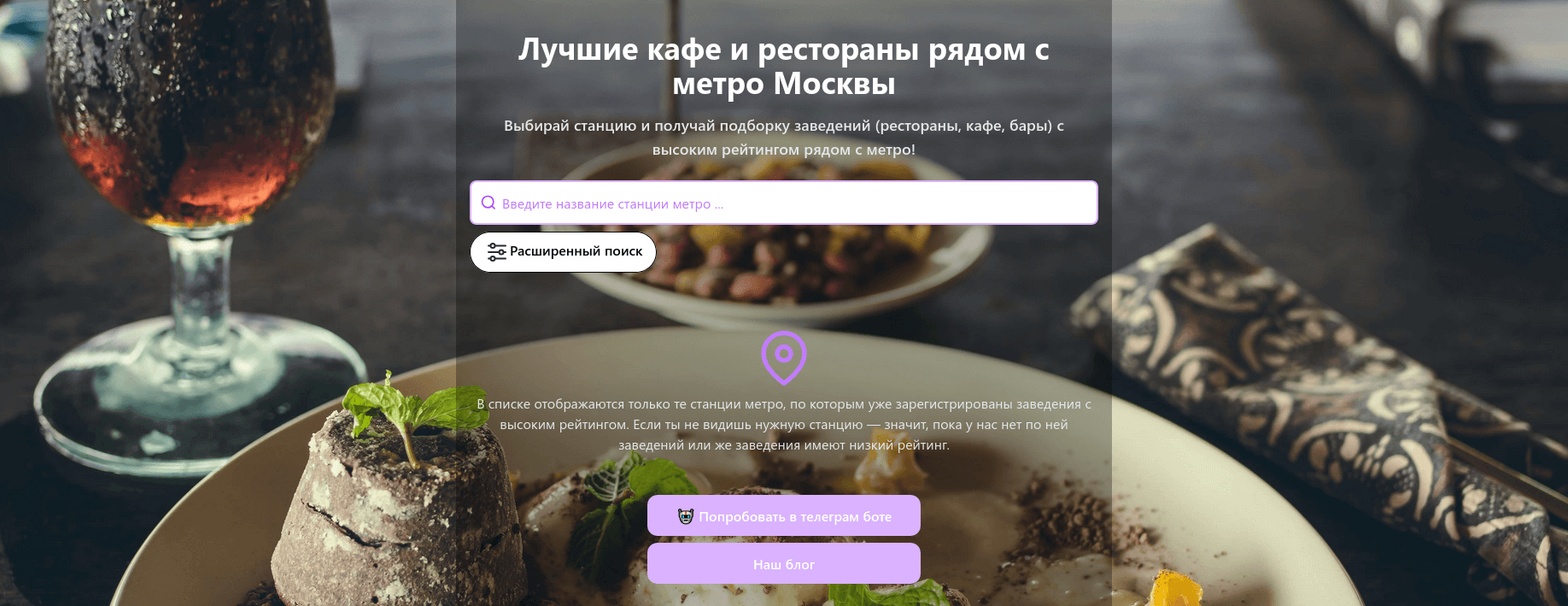 Выбирай станцию и получай подборку заведений (рестораны, кафе, бары) с высоким рейтингом рядом с метро!